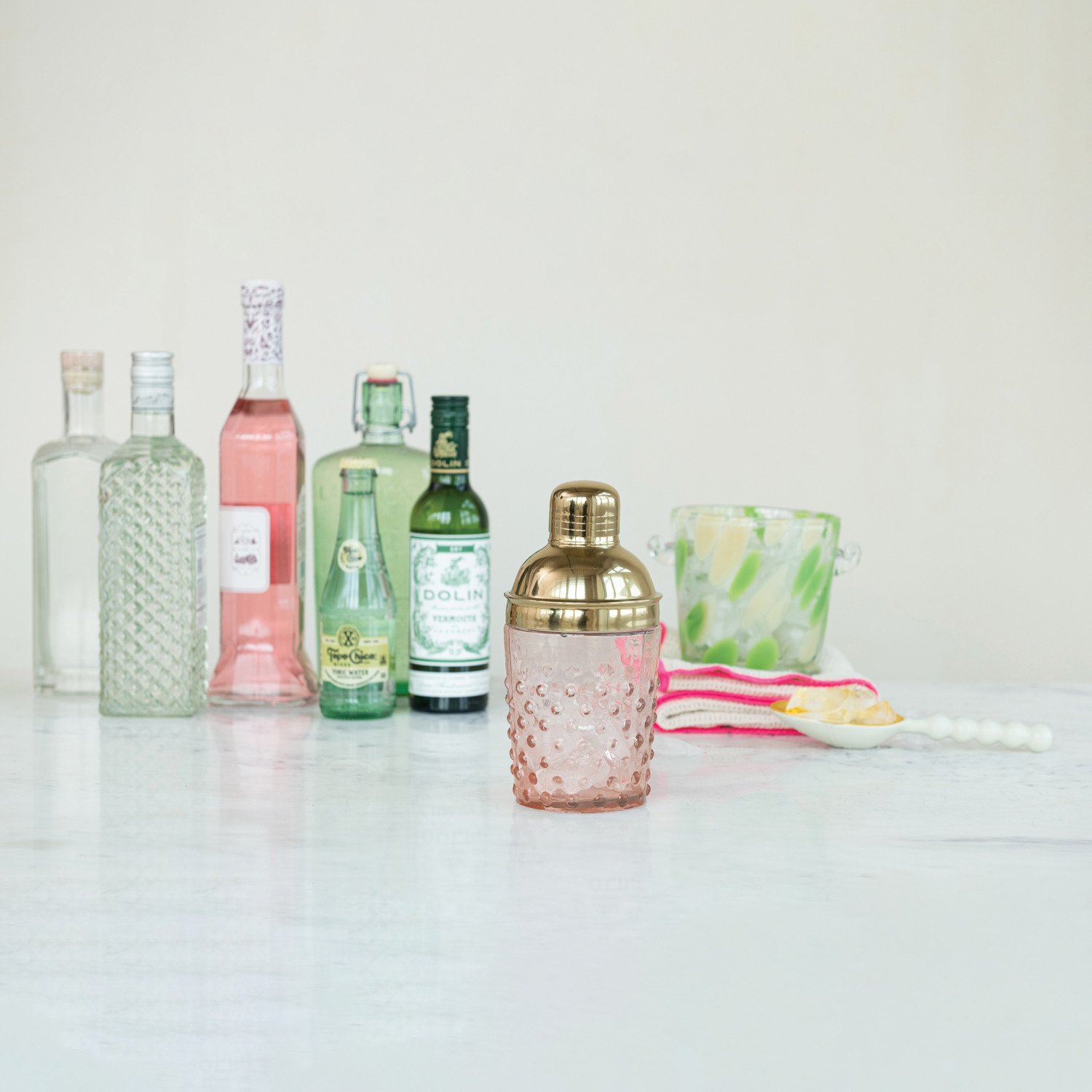 Catalog Name: 3-3/4" Round x 7-1/2"H 14 oz. Stainless Steel & Hand-Blown Glass Hobnail Cocktail Shaker, Gold Finish & Pink