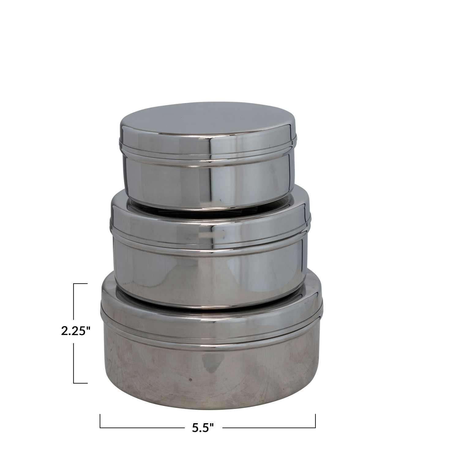 Catalog Name: 5-1/2" Round x 2-1/4"H, 5" Round x 2"H & 4-1/2" Round x 1-3/4"H Stainless Steel Containers, Set of 3