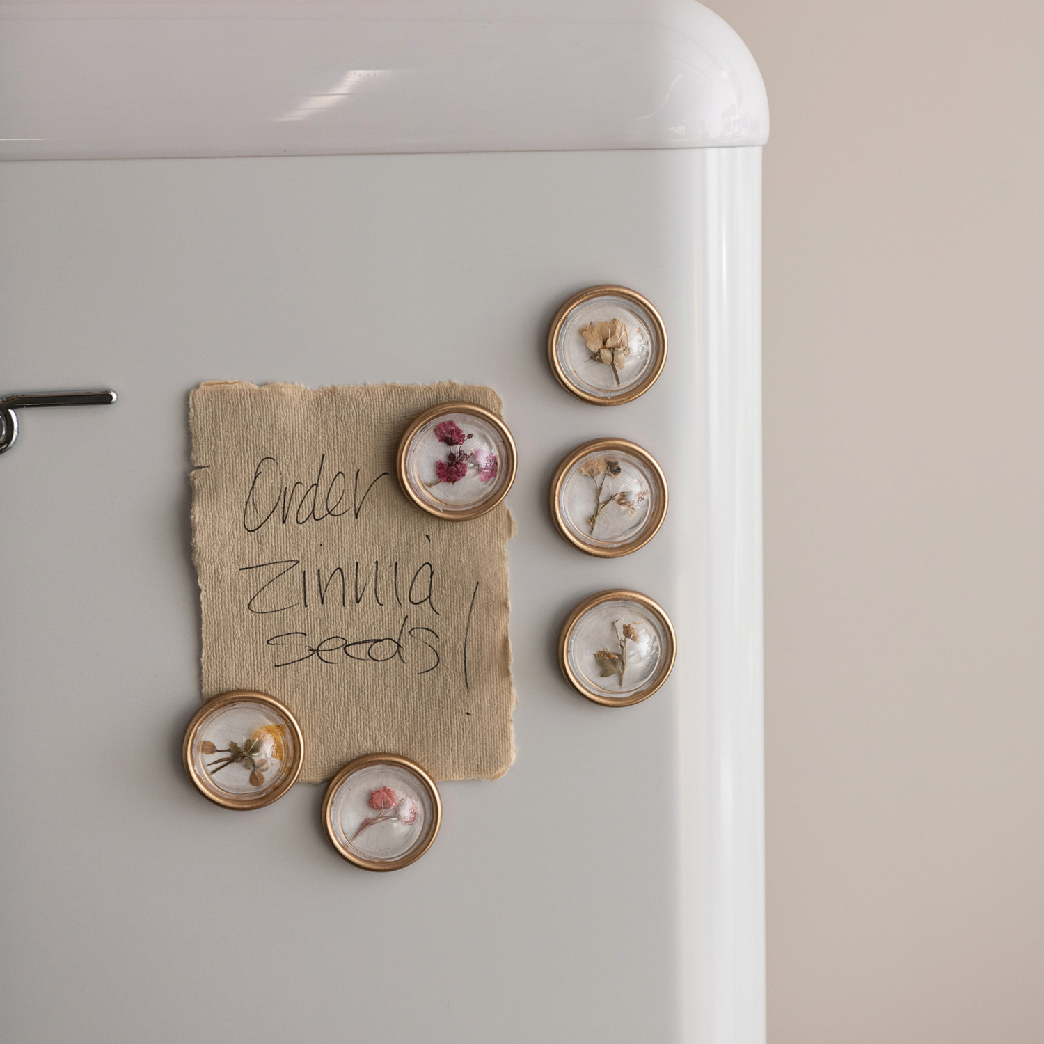 Catalog Name: 1" Round Resin Convex Magnets on Metal Card w/ Botanicals, Gold Finish & Natural, Set of 6