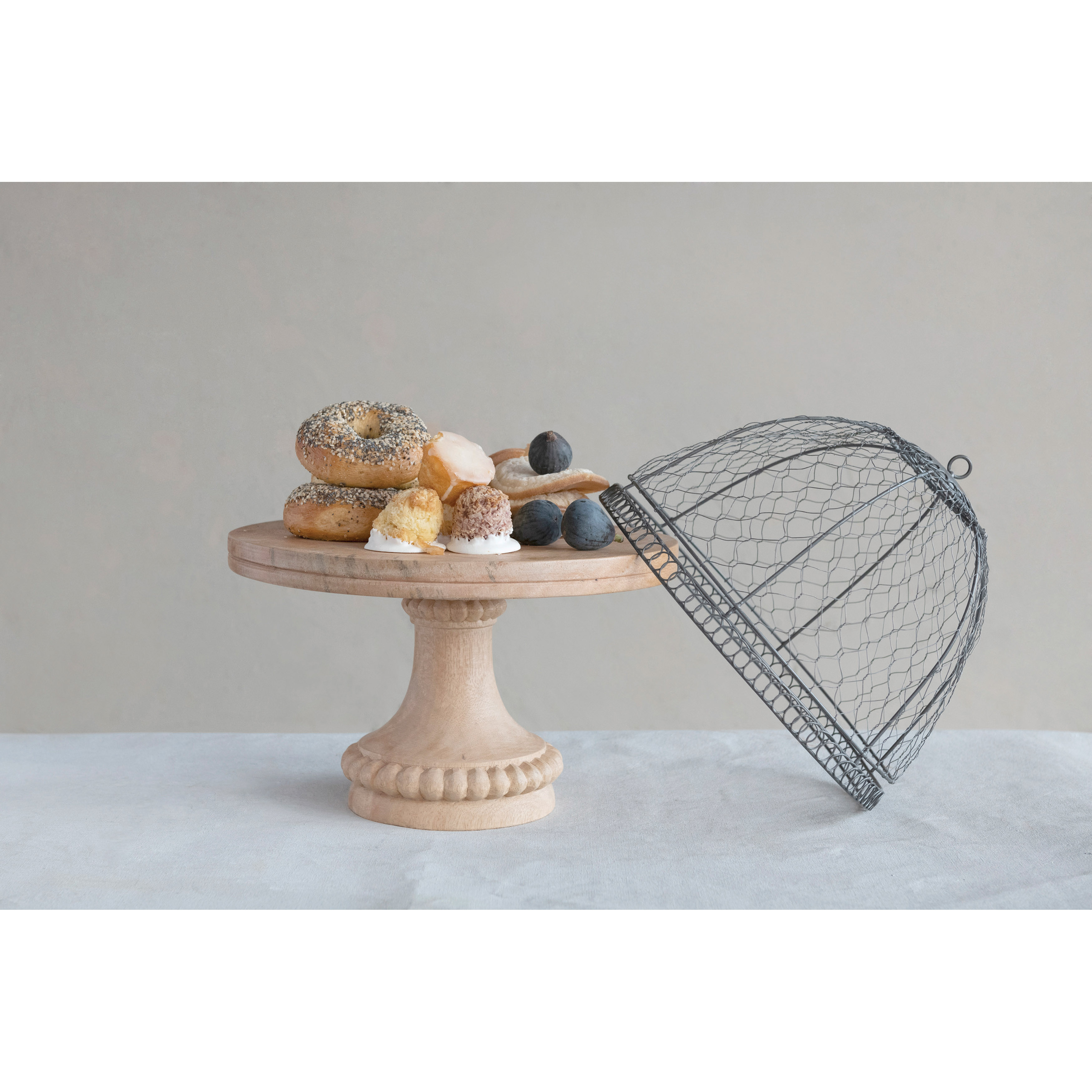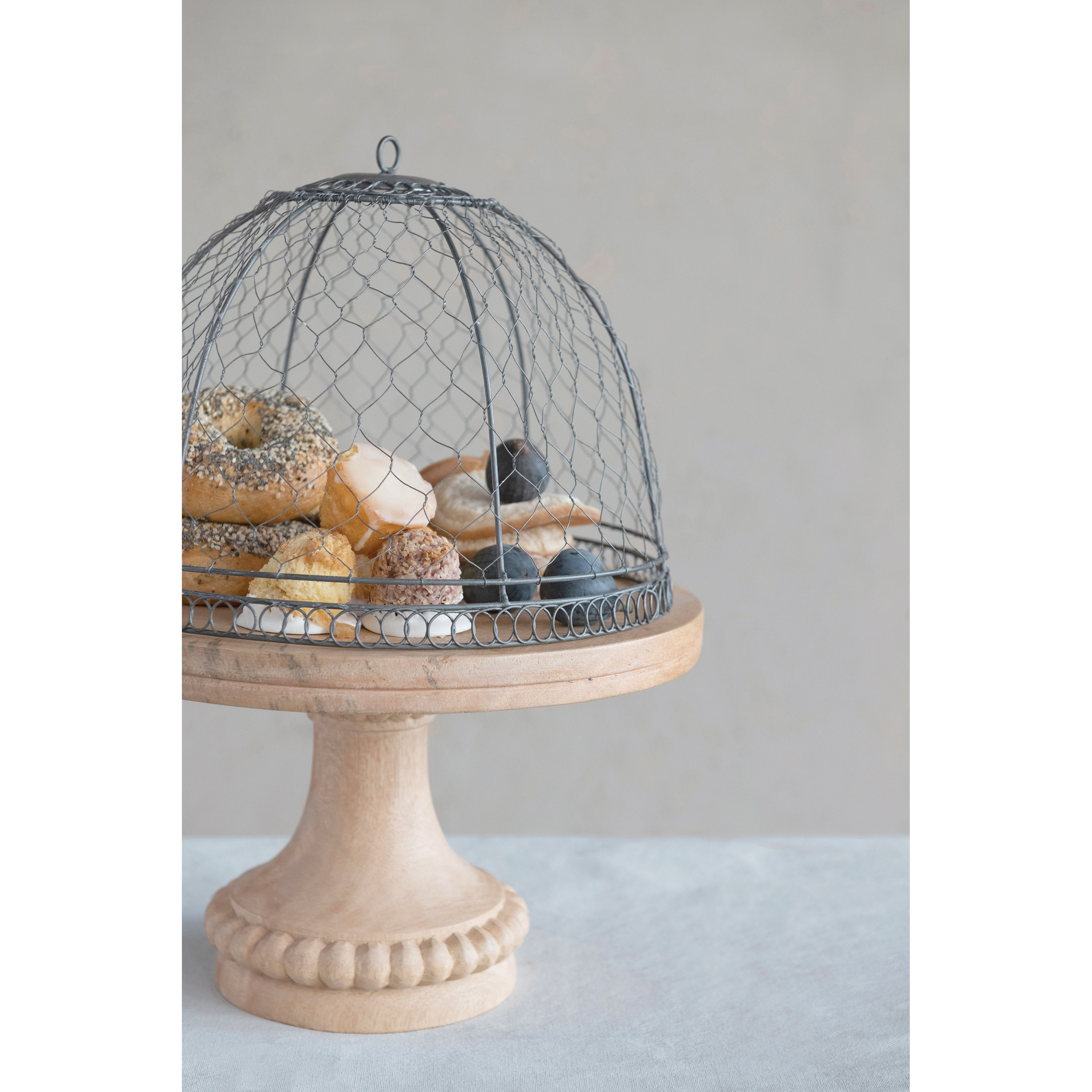Catalog Name: 14" Round x 17"H Metal Wire Cloche w/ Mango Wood Pedestal Base, Zinc Finish, Natural, Set of 2