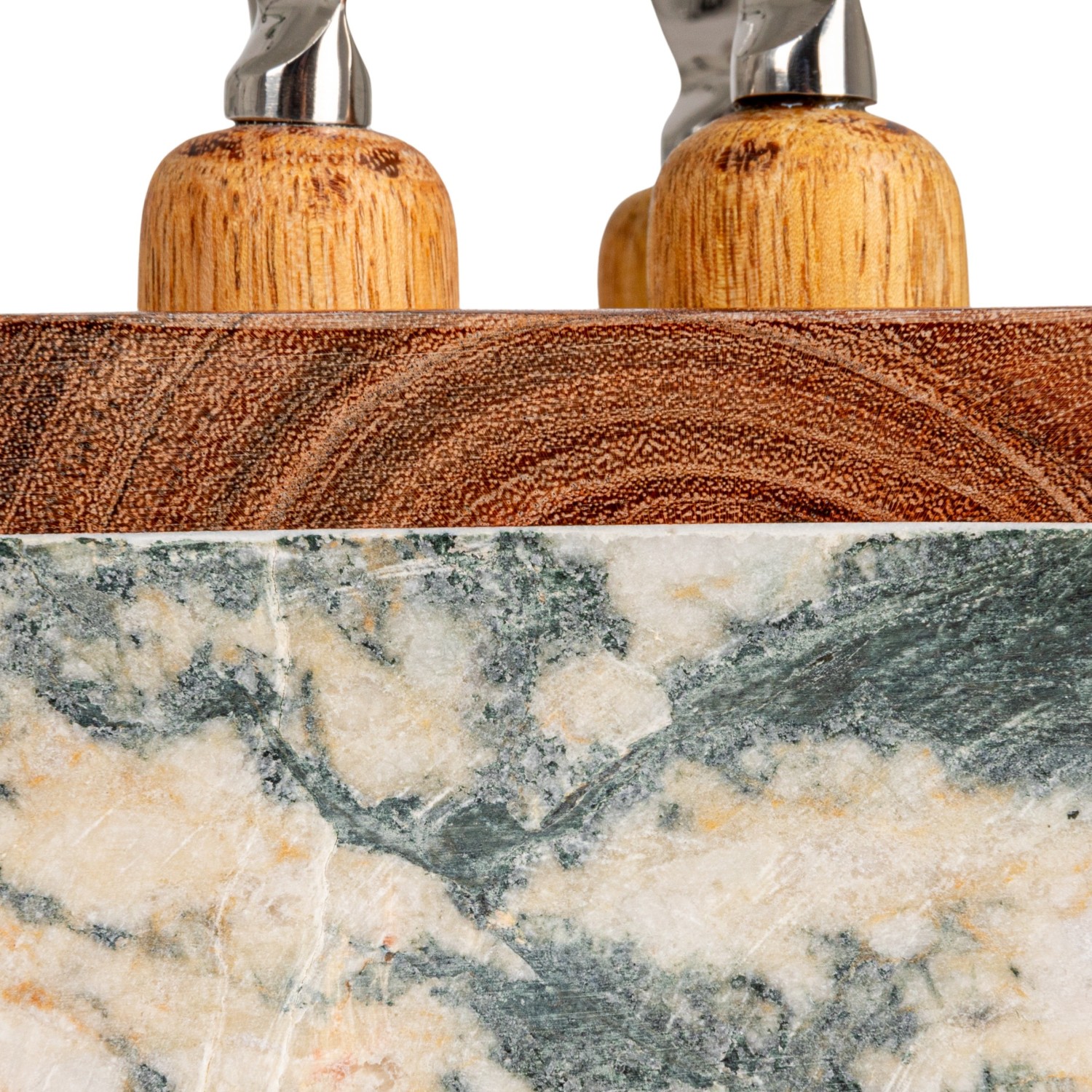 This Marble Majesty Cheese Server Set is a harmonious blend of elegance and practicality. Each utensil, from the chisel knife to the fork, is crafted from the finest marble and designed to handle a variety of cheeses, from soft to hard. The mango wood stand is not just a base; it's a statement piece that enhances the overall presentation. With dimensions that make it perfect for any gathering, this set is sure to be a conversation starter and a testament to impeccable taste in serveware. Whether the home style is Scandinavian, farmhouse, or cottage, these cheese servers will add a touch of sophistication to every entertaining essential. With their sleek design and versatile functionality, these cheese servers are a must-have for any host.
