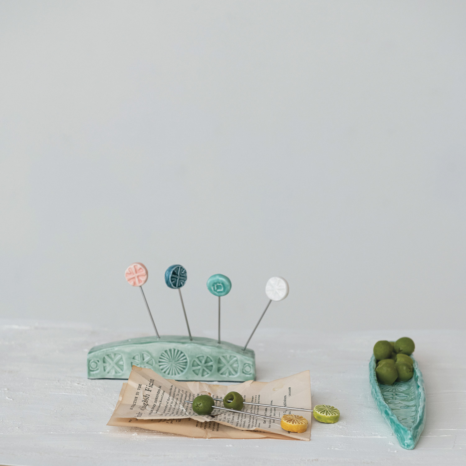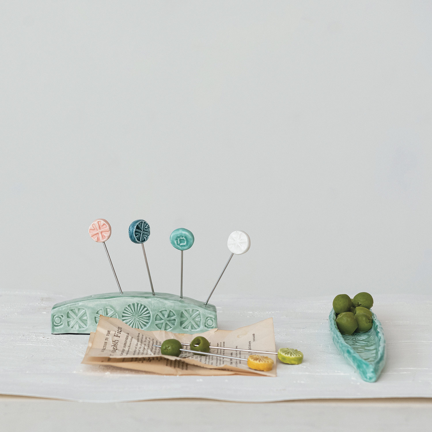 Hand-Painted Debossed Stoneware Olive Dish, Aqua ©