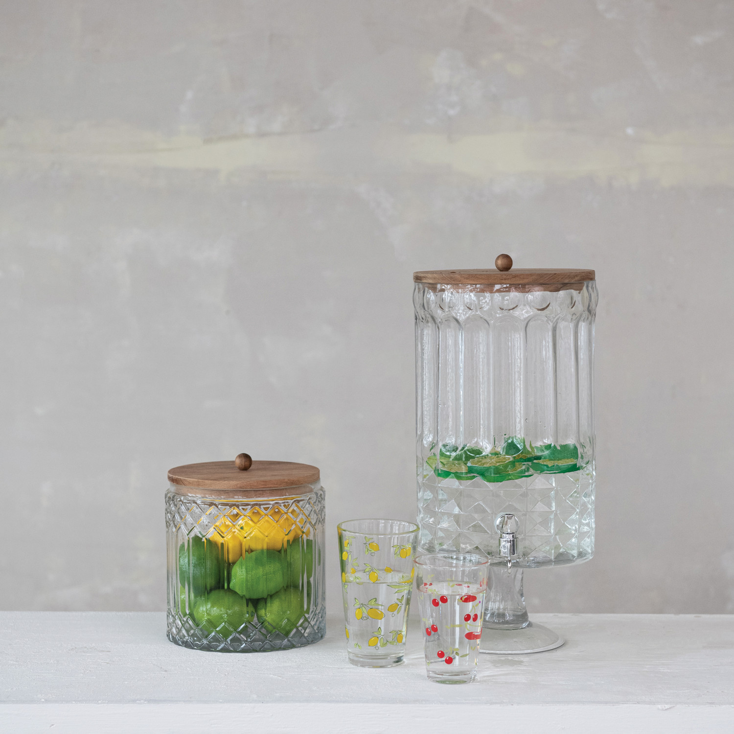 Catalog Name: 7-1/2" Round x 20-1/4"H 8 Quart Cut Glass Footed Beverage Dispenser w/ Plastic Spout & Acacia Wood Lid, Silver Finish & Natural