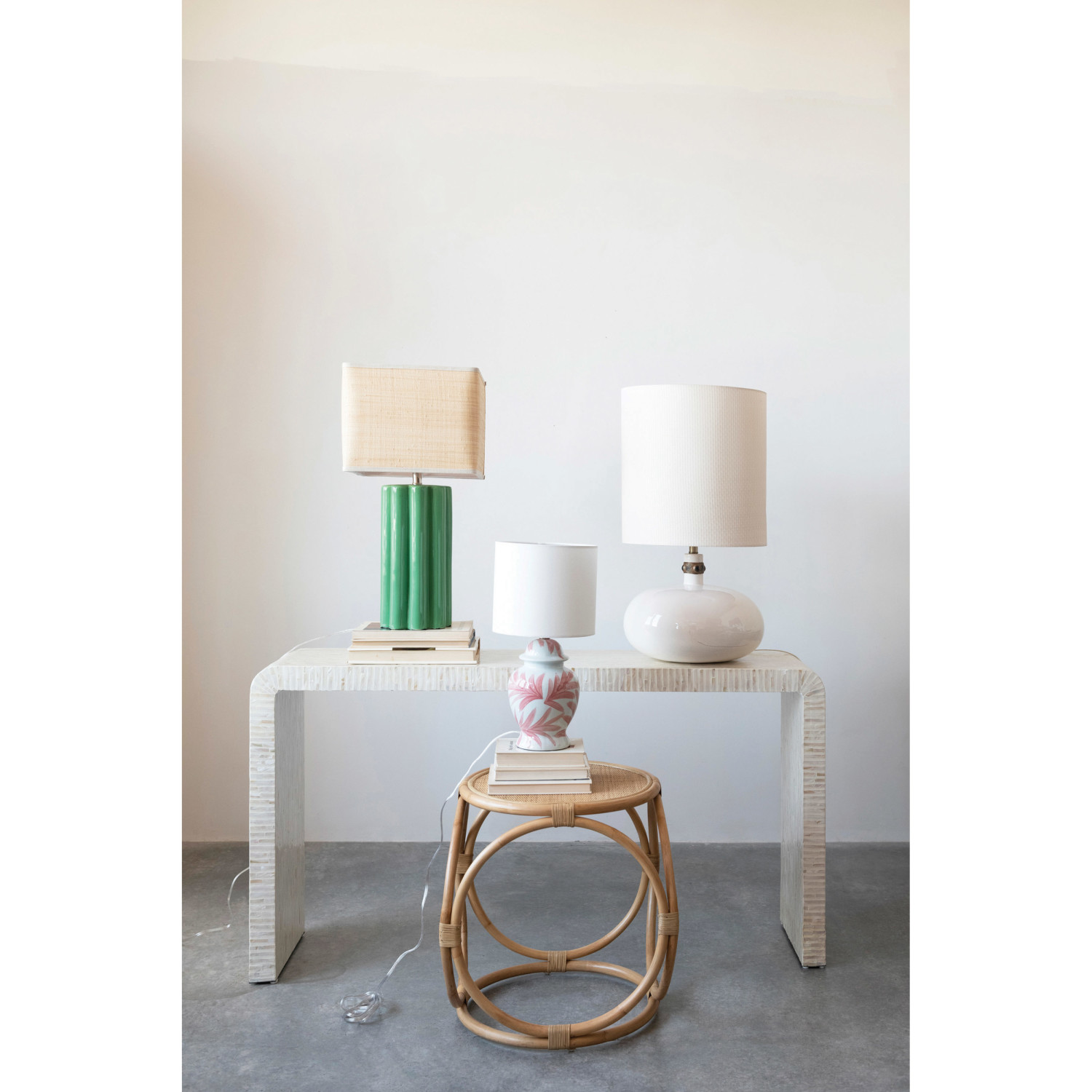 A stunning and modern table lamp that features a bright green stoneware base with a fluted sculptural shape, topped with a natural raffia shade. Ideal for adding a touch of color and texture to any room, especially for bohemian, eclectic, or contemporary home décor styles. Requires 1 150-watt bulb (not included); No switch on the lamp; Equipped with a rotary switch on the base for easy on and off. Made of stoneware, metal, raffia, and cord.