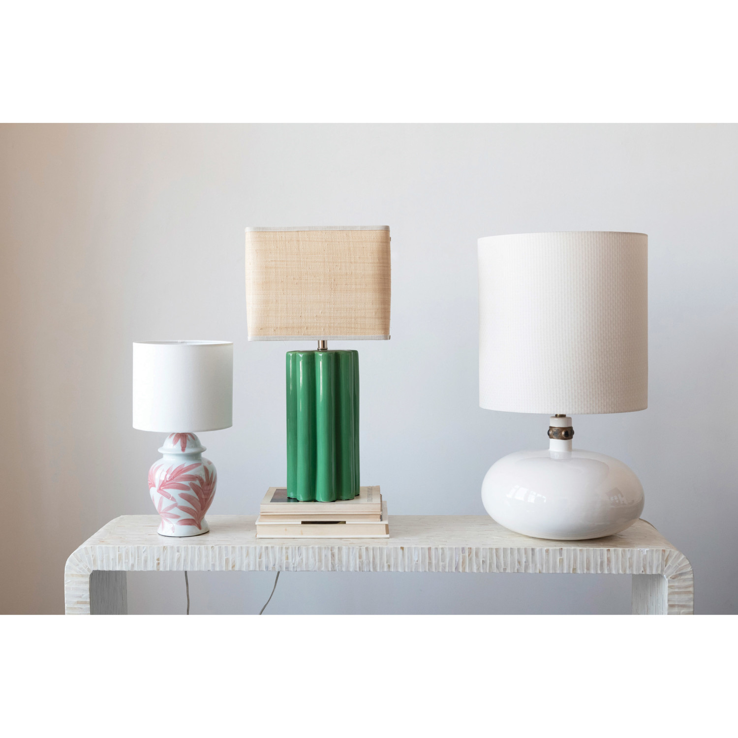 Catalog Name: 15" Square x 28-1/2"H Stoneware Fluted Table Lamp w/ Raffia Shade, Green & Natural, Truck Ship