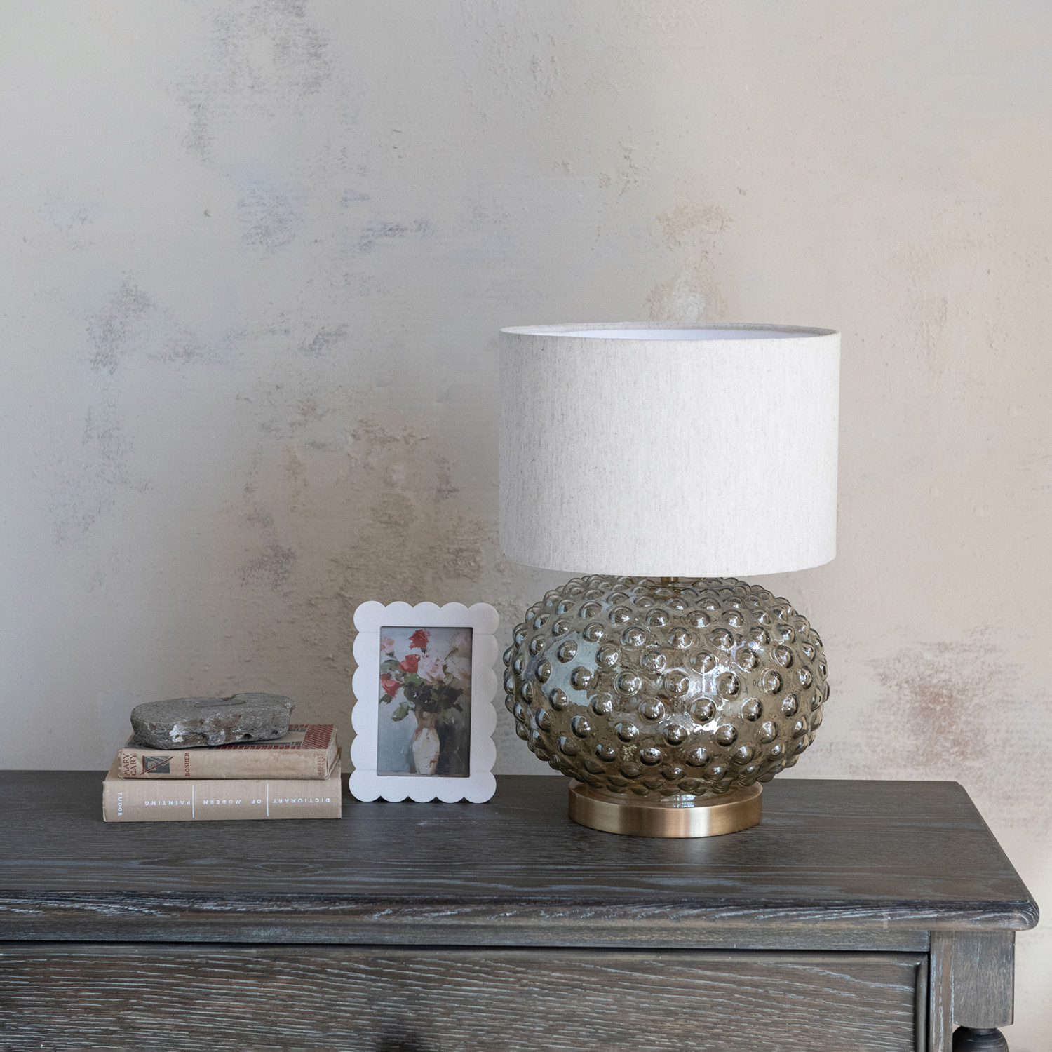 Catalog Name: 12" Round x 17-1/2"H Glass Hobnail Table Lamp w/ Brass Finish Base, Cotton Shade & Inline Switch, Metallic Finish & Smoke Color