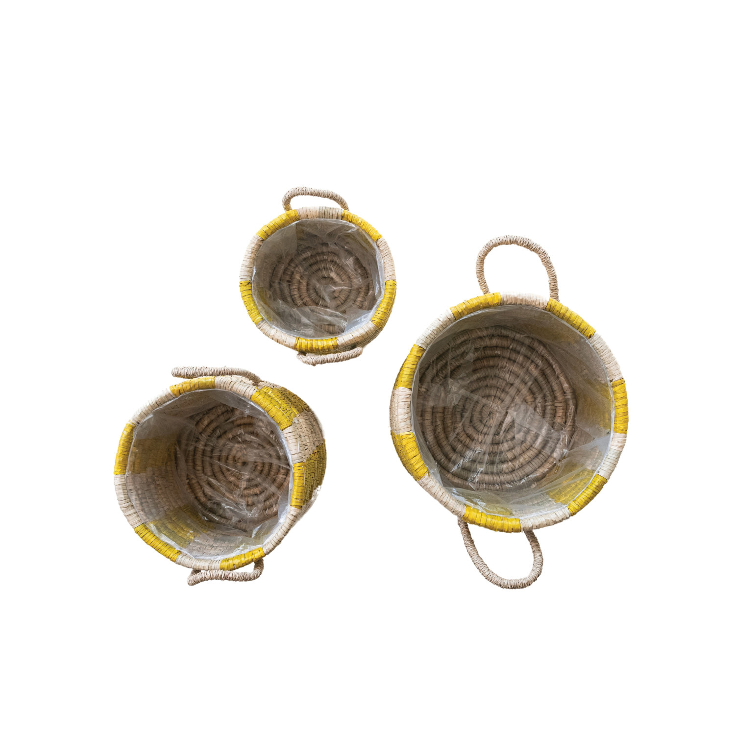 Catalog Name: 13" Round x 12"H, 11" Round x 11"H & 9" Round x 8-1/2"H Hand-Woven Seagrass Striped Baskets w/ Handles & Plastic Liners, Natural & Yellow, Set of 3
