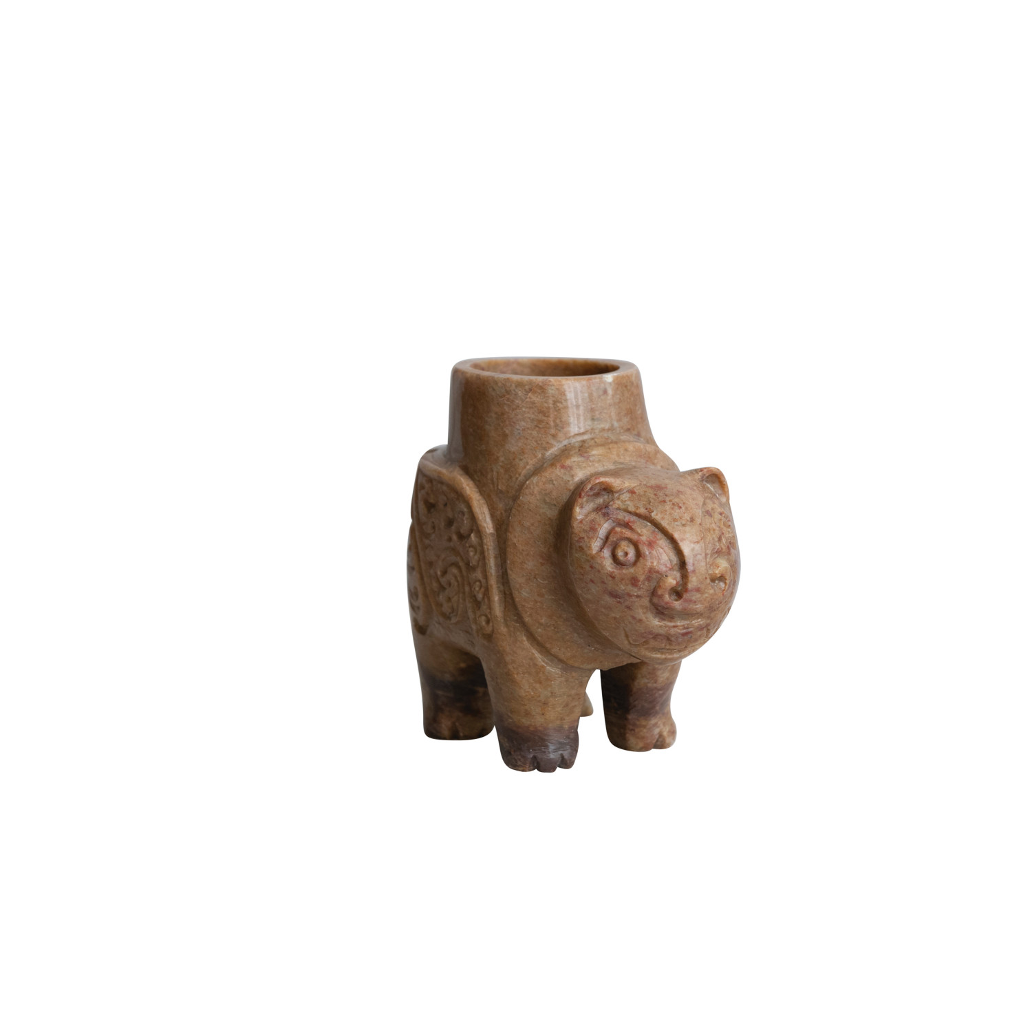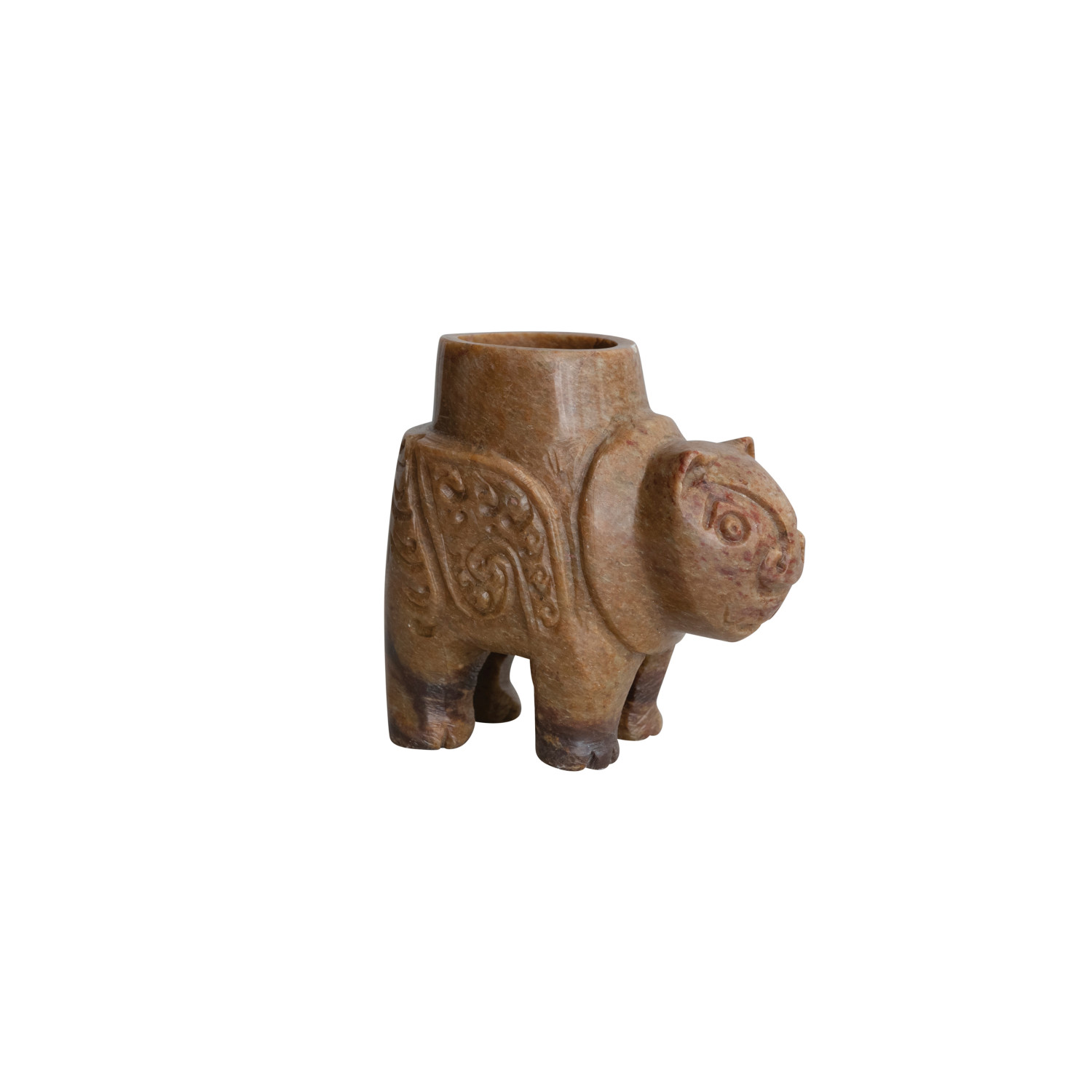Mix and match the sculptural silhouettes, stylish hues, and unique finishes of our candle and incense holder collection to create the ultimate tablescape. Instantly transform a dining table, dresser, or mantelpiece into a stunning display of ambiance and warmth with carefully chosen bases for a refined candlelight arrangement. Choose from a wide array of materials from iron and marble to wood and stone, and styles from mid-century modern and glam to farmhouse and vintage. From classic taper holders to global-inspired pillar holders and contemporary incense burners and shimmering votives, this collection will create a welcoming atmosphere that is guaranteed to impress. This global-inspired soapstone tealight candleholder showcases the masterfully hand-carved silhouette of a mythical creature. Display in a living space of any style from global to eclectic. Add a touch of personal style to a mantelpiece or shelfscape with this candle holder. Made from soapstone.