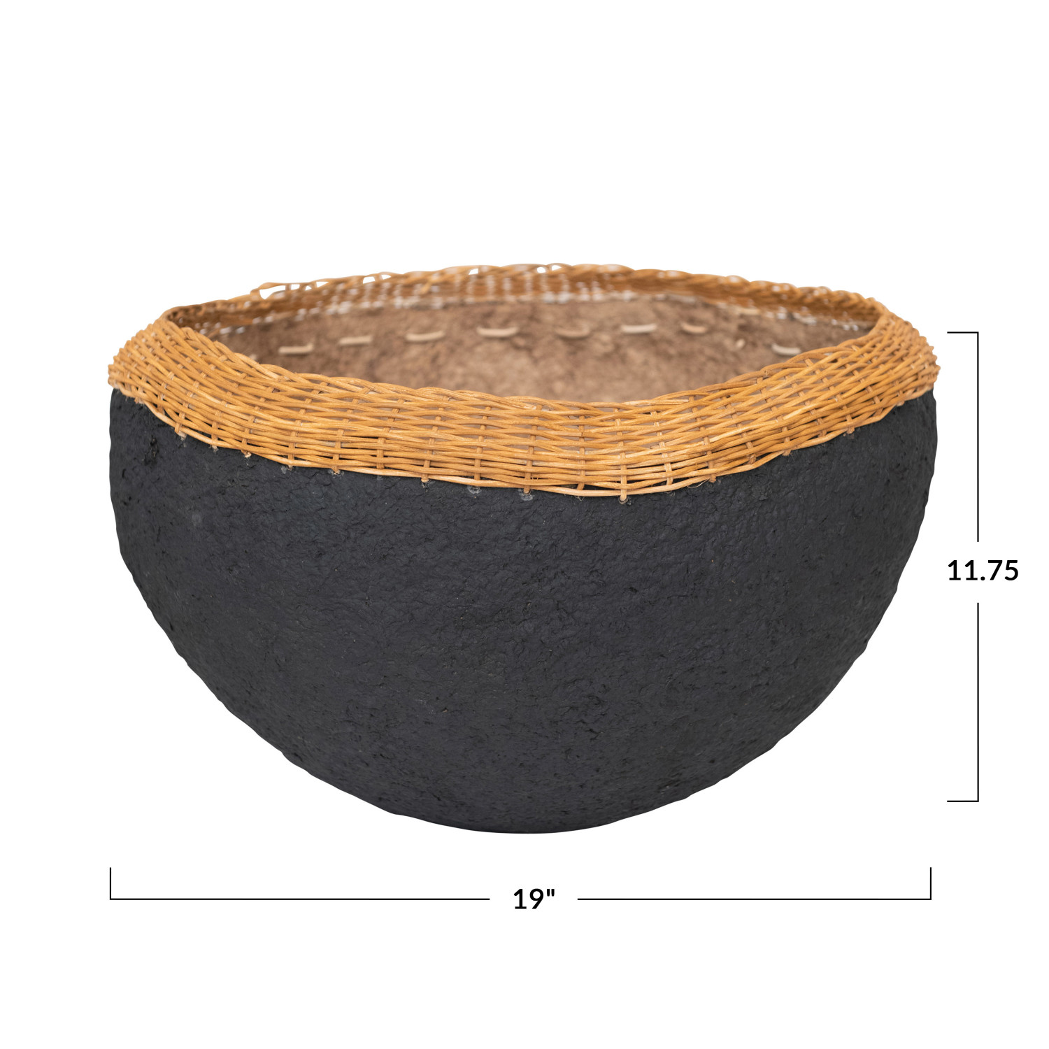 Catalog Name: Approximately 19" Round x 11-3/4"H Decorative Handmade Paper Mache Bowl w/ Hand-Woven Wicker Rim, Black & Natural (Each One Will Vary)