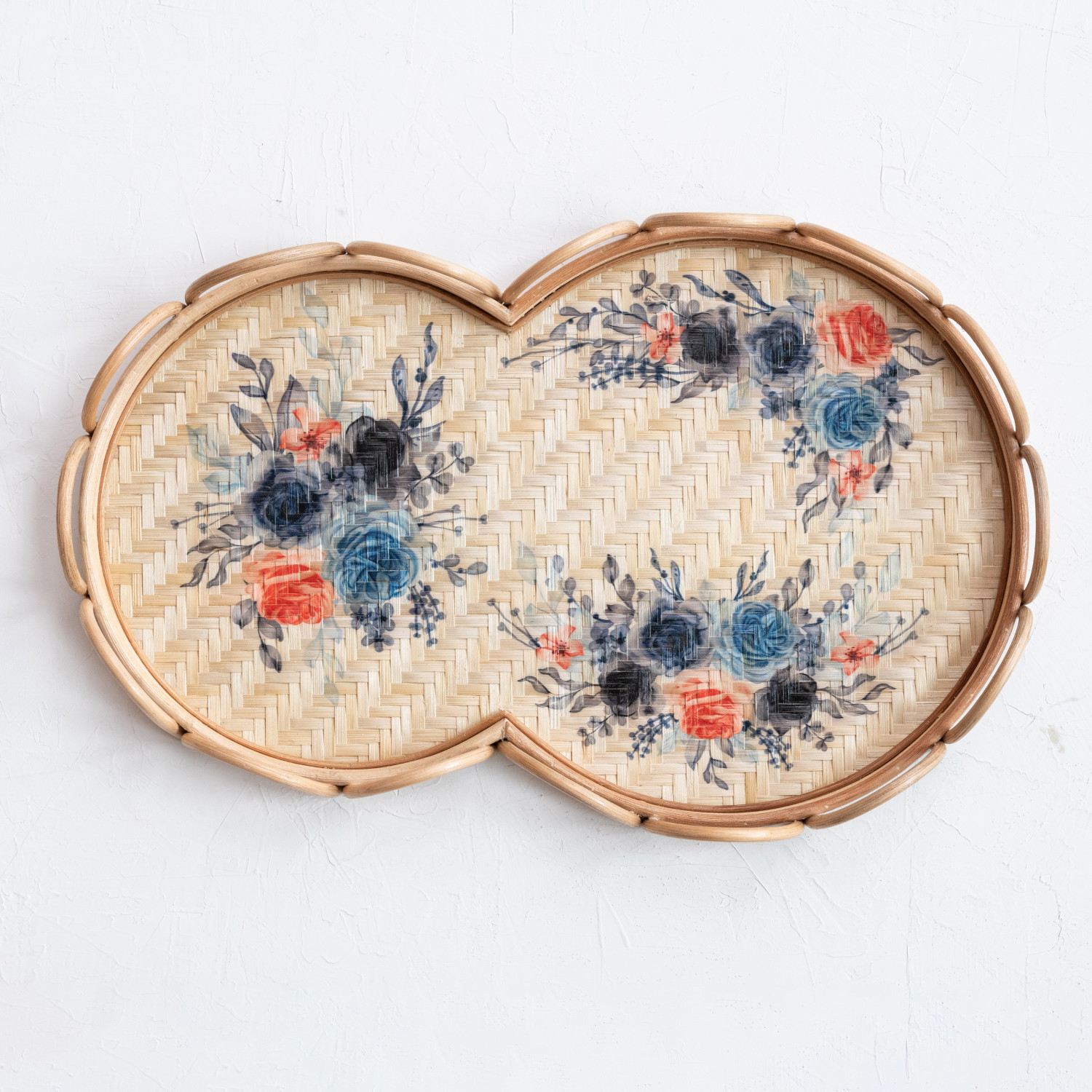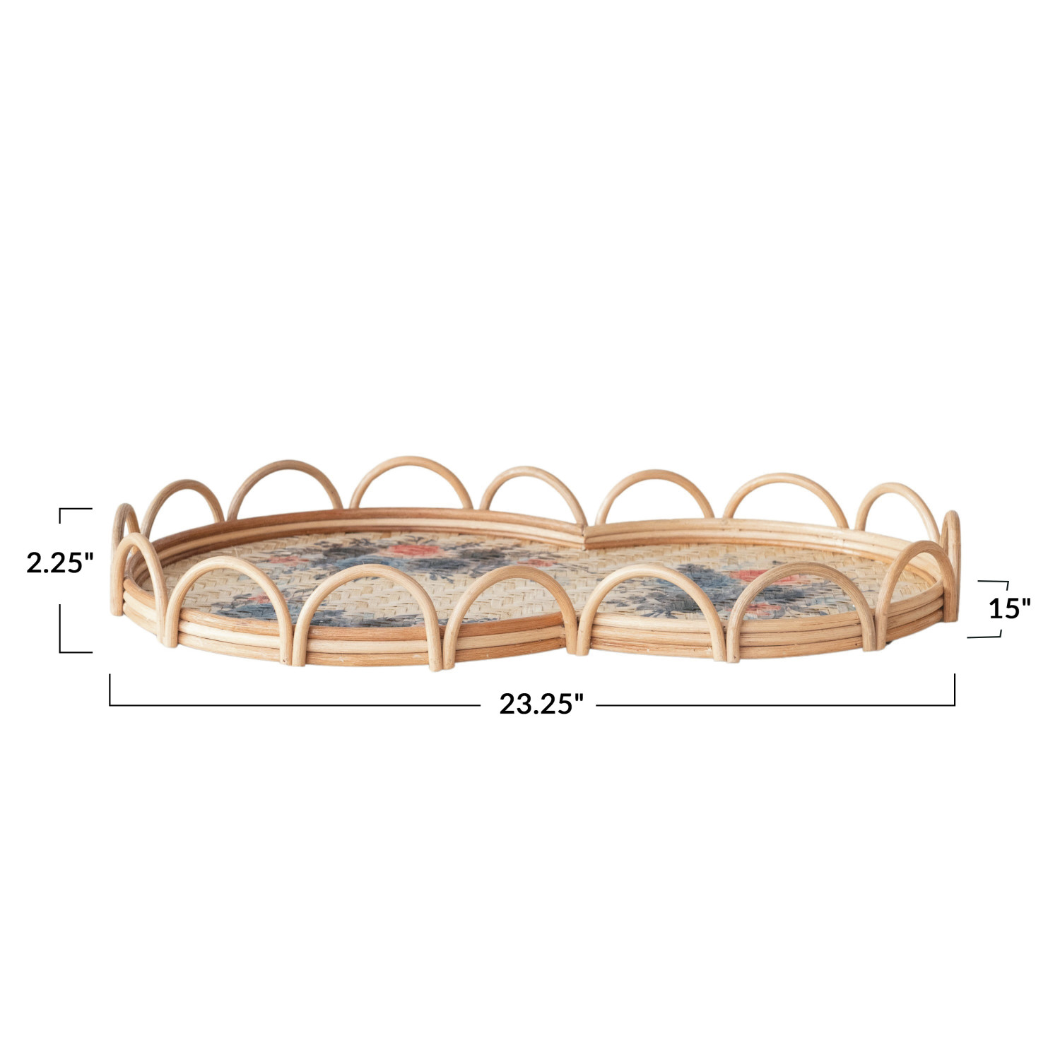 Catalog Name: 23-1/4"L x 15"W x 2-1/4"H Decorative Rattan, Bamboo & MDF Scalloped Tray w/ Printed Florals, Multi Color