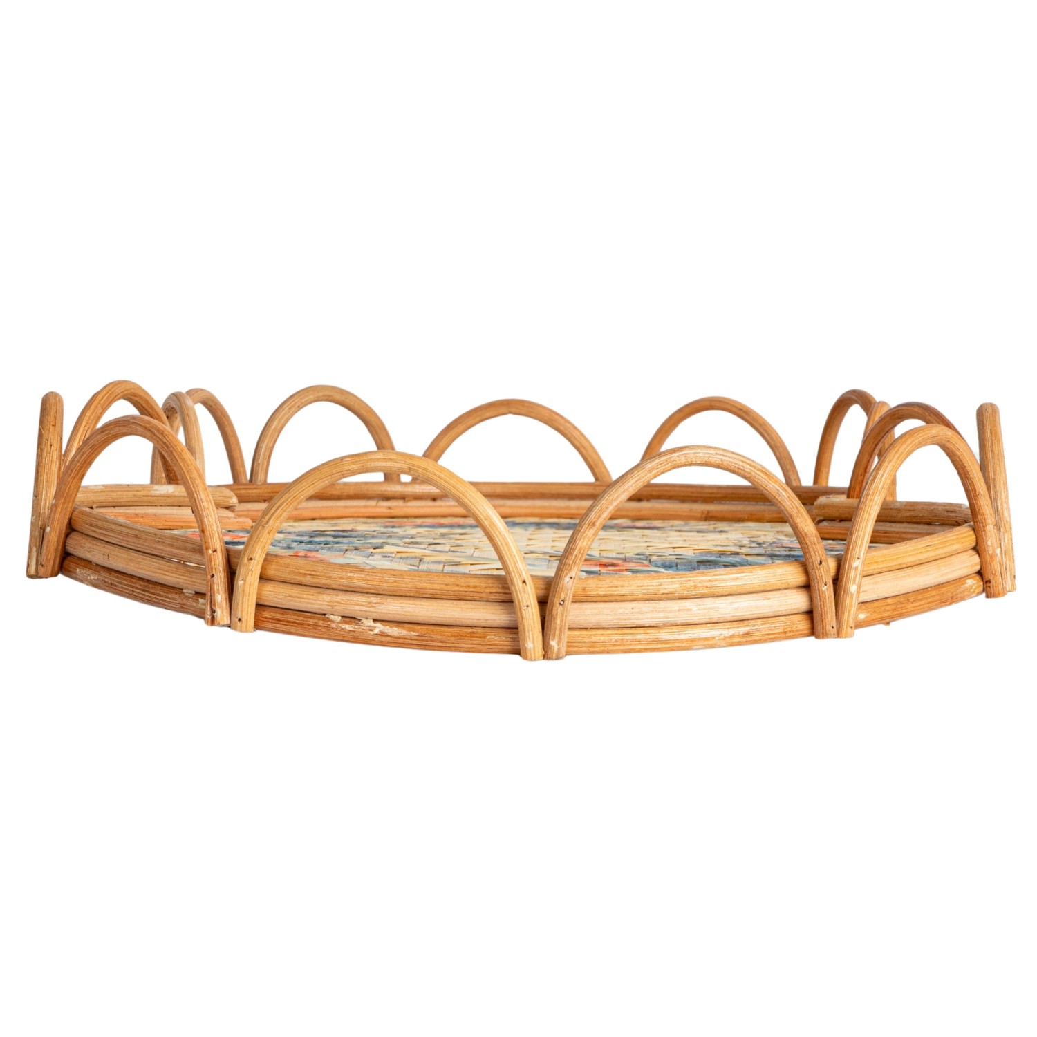 This Decorative Rattan and Bamboo Scalloped Tray is a true celebration of craftsmanship and design. With its generous size of 23.25 inches long and 15 inches wide, it's perfect for serving guests or displaying favorite items. The multi-colored floral patterns bring a burst of life to any room, while the natural materials of bamboo and rattan offer a sustainable and stylish option for the home. The tray's oval shape and scalloped edges provide an elegant touch, making it a versatile piece that complements boho, modern, or Southwestern decor. Whether used for practical purposes or as a statement piece, this tray is sure to captivate and delight.