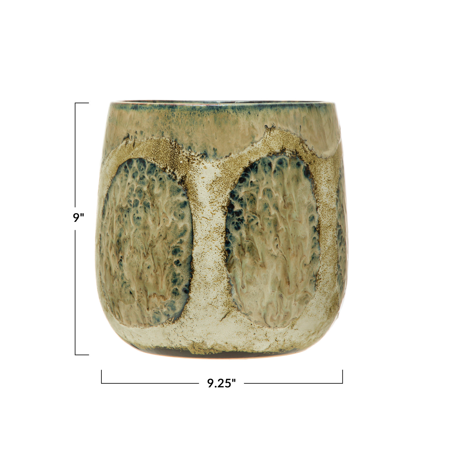 Personality and flair are added to any home or garden with this multicolor stoneware planter with a reactive glaze. This round planter features a reactive glaze that creates a unique and colorful pattern that varies from piece to piece, giving it a gorgeous and vibrant look. This planter also has an organic shape that adds some charm and character to the design. This planter does not have drainage holes, so it can be used as a decorative planter for succulents or cacti that do not need much water, or as a pot holder for an 8-inch pot. This planter is made of high-quality stoneware, which is a durable and sturdy material that can resist chipping and cracking. This planter measures 9.25 inches in diameter and 9 inches in height, making it a spacious and beautiful piece that can fit in any space. Whether placed on a windowsill, shelf, table, or countertop, this multicolor stoneware planter with reactive glaze adds personality and flair to any home. A gorgeous round planter with a reactive glaze that creates a unique and colorful pattern and an organic shape that adds some charm and character. This planter is suitable for bohemian, eclectic, or modern style homes, or any space that needs some personality and flair. This planter does not have drainage holes, so one can use it as a decorative planter for succulents or cacti that do not need much water, or as a pot holder for an 8-inch pot. Made of stoneware.