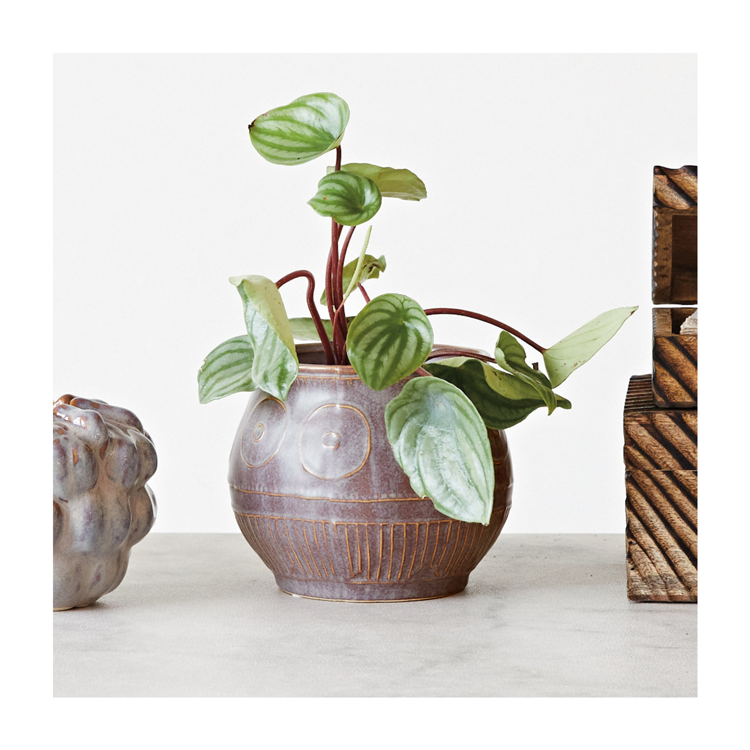 Catalog Name: 6-1/2" Round x 5"H Embossed Stoneware Planter w/ Pattern, Reactive Glaze, Plum Color (Holds 5" Pot) (Each One Will Vary)