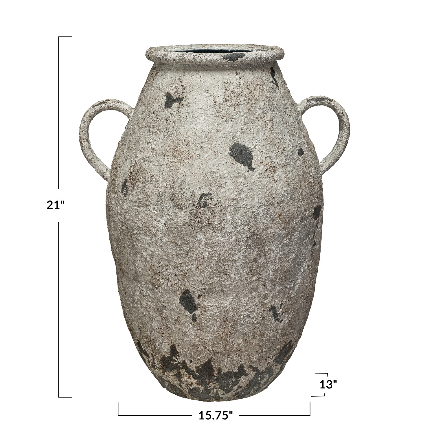 This Metal Urn, with its heavily distressed white finish and practical handles, is a nod to pastoral life and vintage aesthetics. Its round shape and generous size make it a versatile choice for a variety of decorative purposes. The urn's design is reminiscent of a simpler time, yet it fits seamlessly into the modern home, offering a bridge between the rustic and the refined. Its metal construction ensures durability, while the distressed finish adds character, making each piece uniquely its own. It measures 15.75 inches in length, 13.0 inches in width, and 21.0 inches in height, complete with handles for easy transport. Whether used to hold a bountiful bouquet or standing proudly on its own, this urn is a statement piece that brings a sense of tranquility and nostalgia to any space.