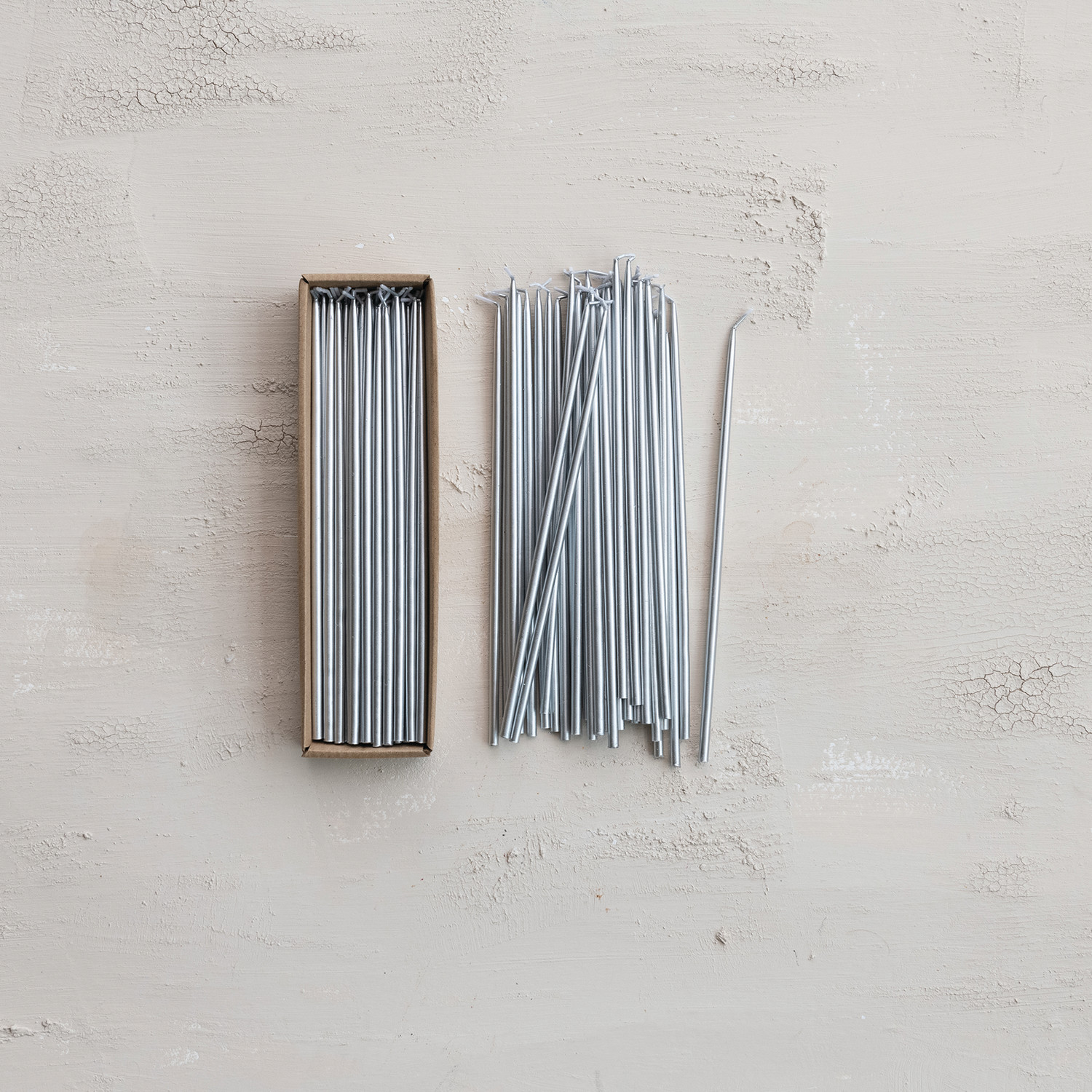 Catalog Name: Approx. 1/4" Round x 10"H Unscented Thin Taper Candles in Box, Silver Color, Set of 36 (Est. Burn Time 1-1/2 Hours)