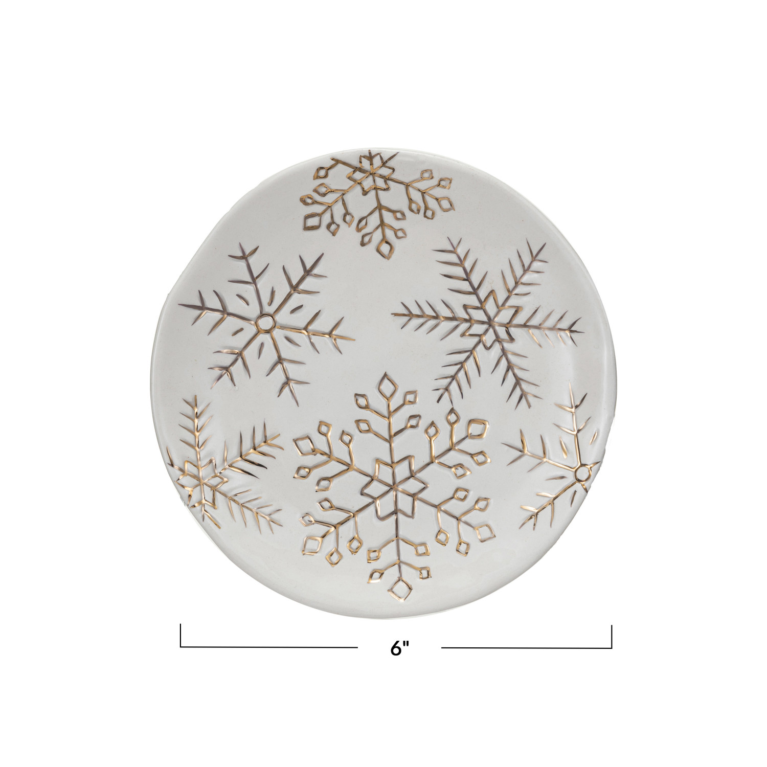 Catalog Name: 6" Round Stoneware Plate w/ Gold Electroplated Snowflakes, White