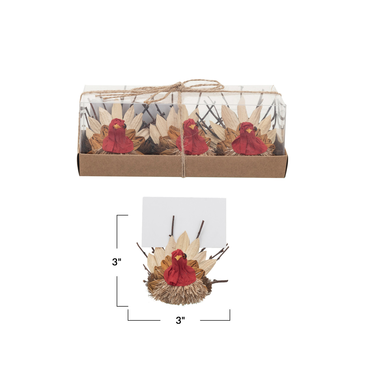 This set of dried natural corn husk turkeys with place card/photo holders, natural and orange, in a box is a festive and rustic accessory for the fall or Thanksgiving table. The set includes three turkeys that feature dried natural corn husks in natural and orange colors, twigs for legs and tails, and foam for heads and beaks. The turkeys are handmade with care and attention to detail and have a natural and cozy texture. The turkeys also have metal clips that can hold place cards or photos. The set comes in a box, which makes it easy to store or gift. The turkeys measure 3 inches in length and 3 inches in height. The round shape is simple and elegant and can be placed on any surface. The turkeys are ideal for holding place cards or photos or for adding some charm and fun to table setting. Whether hosting a family dinner, a friends' gathering, or a potluck, these will make the table more festive and rustic.