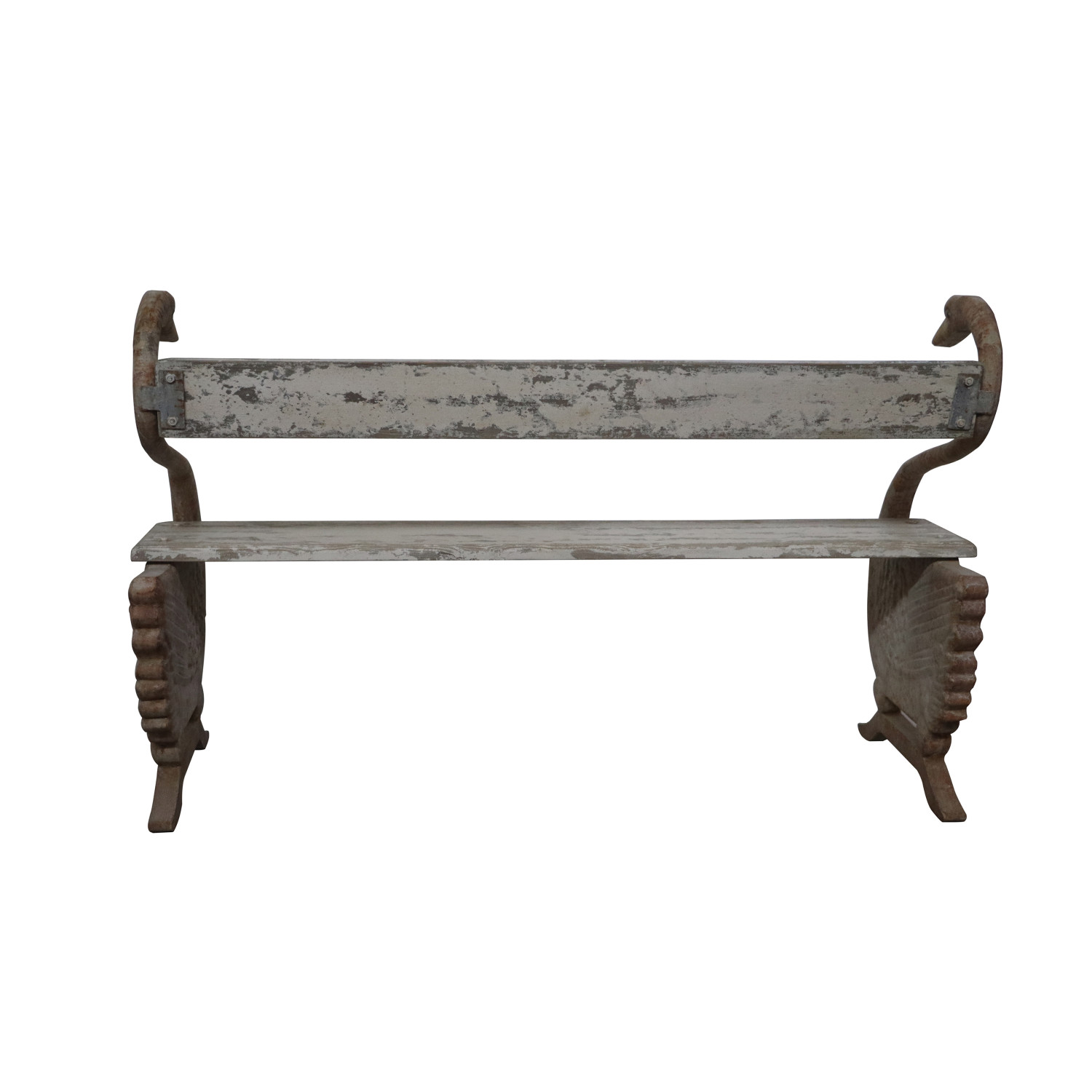 Catalog Name: 59-3/4"W x 21-1/2"D x 36-1/2"H Metal & Pine Wood Vintage Reproduction Bench w/ Swans, Distressed Finish, Antique White, KD, Truck Ship