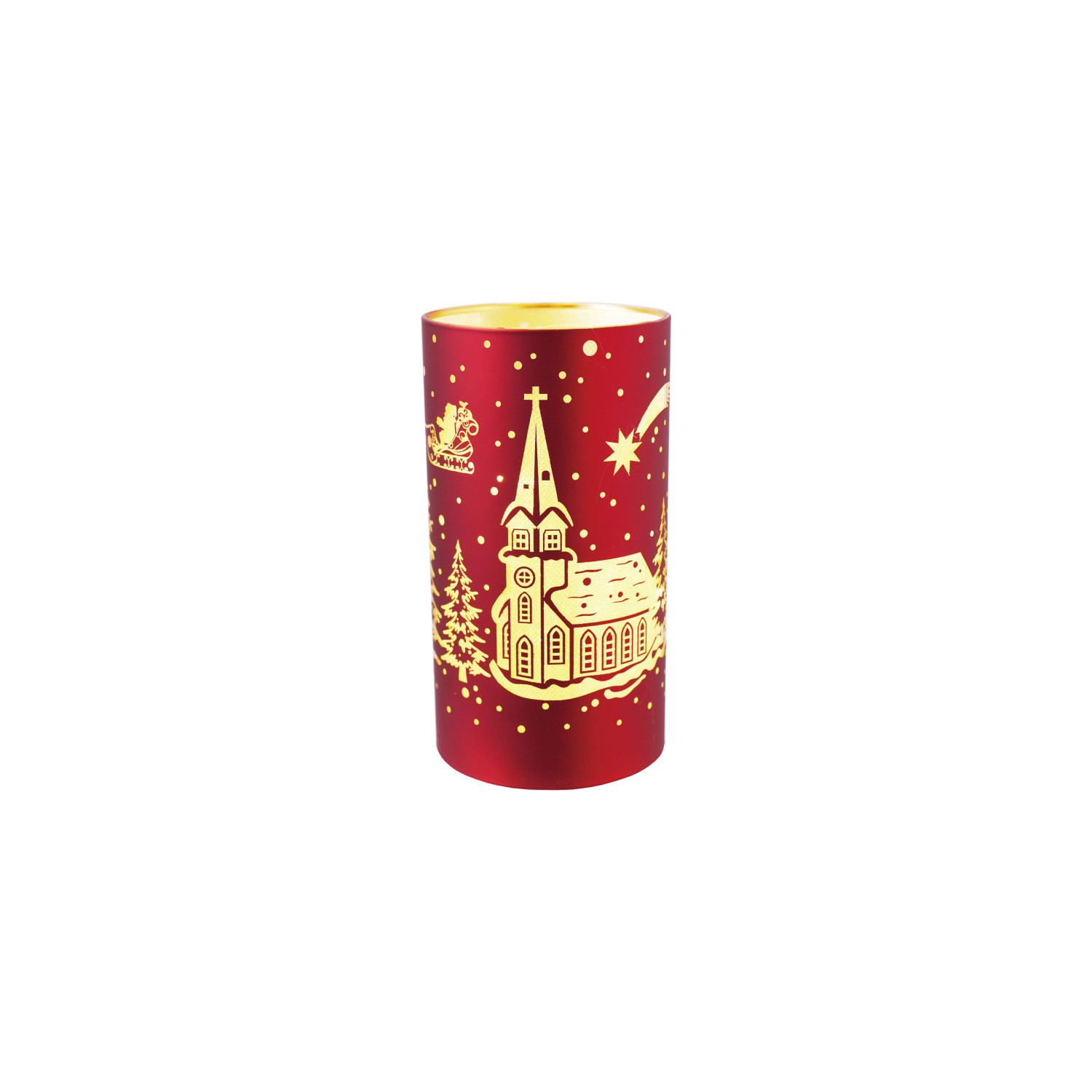 Catalog Name: 3" Round x 6"H Glass LED Light w/ Laser Etched Santa's Sleigh Scene, Matte Red & Gold Finish (Requires 3-AA Batteries)