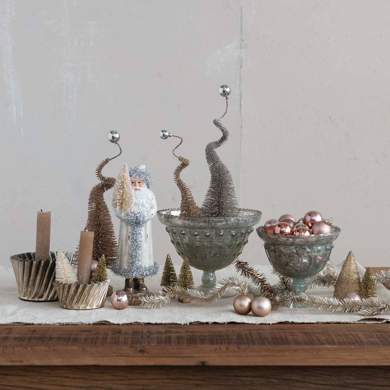 Catalog Name: 3" Round x 10"H Resin Santa w/ Tinsel & Bottle Brush Tree, Cream Color & Nickel Finish