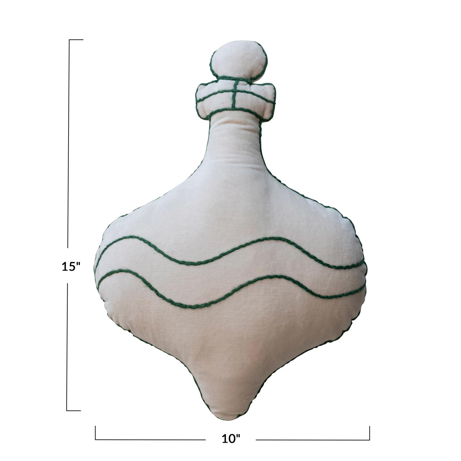 15"L x 10"W Cotton Velvet Ornament Shaped Pillow w/ Embroidery, Natural & Green