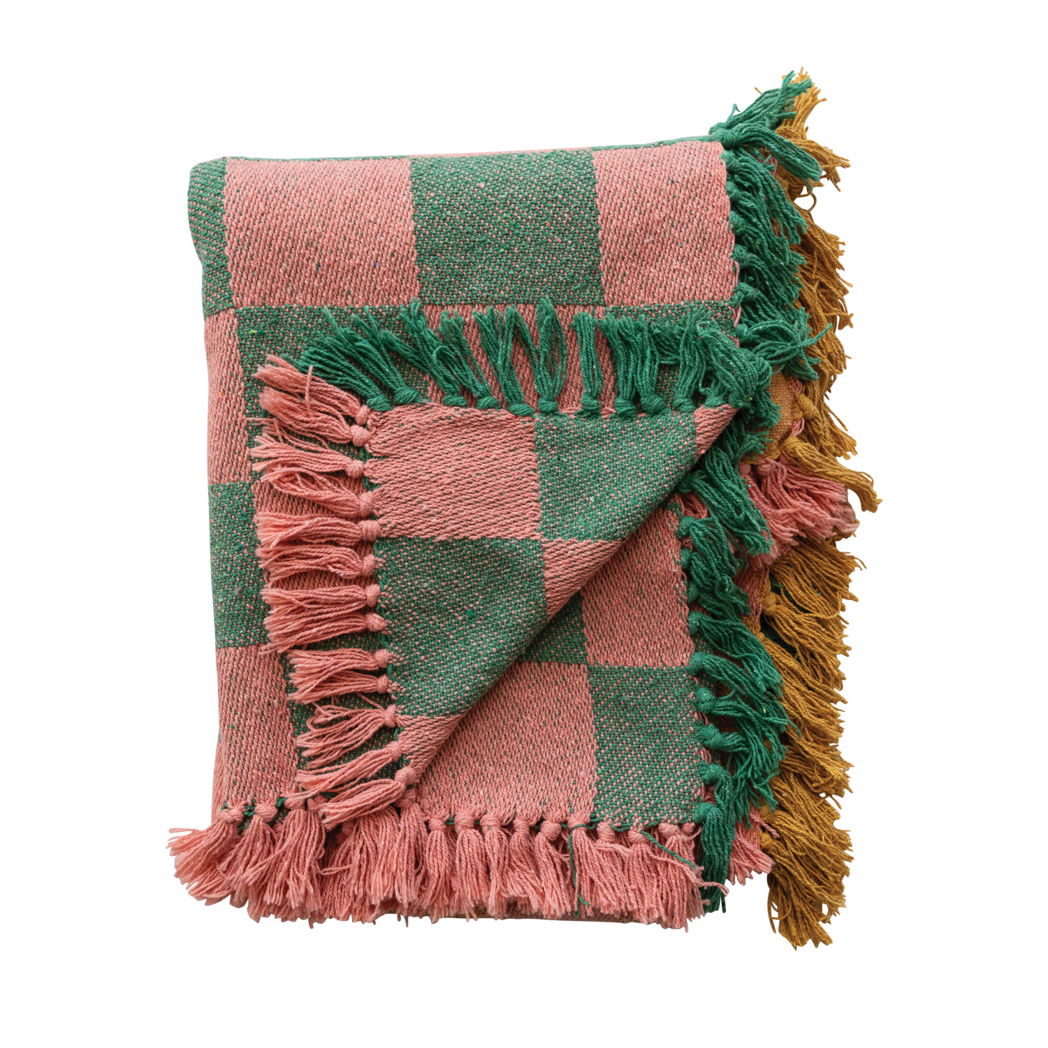 Catalog Name: 60"L x 50"W Woven Recycled Cotton Blend Two-Tone Checked Throw w/ Fringe, Multi Color
