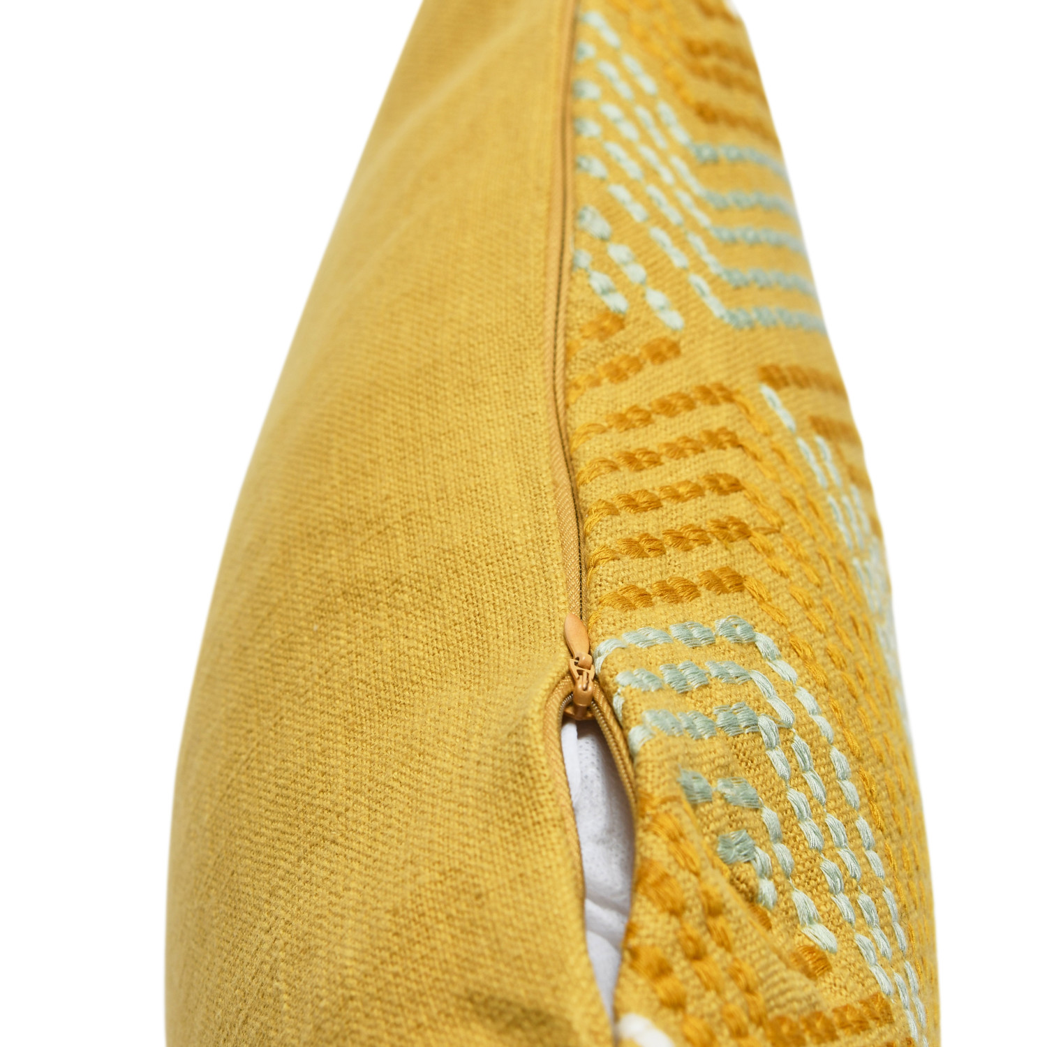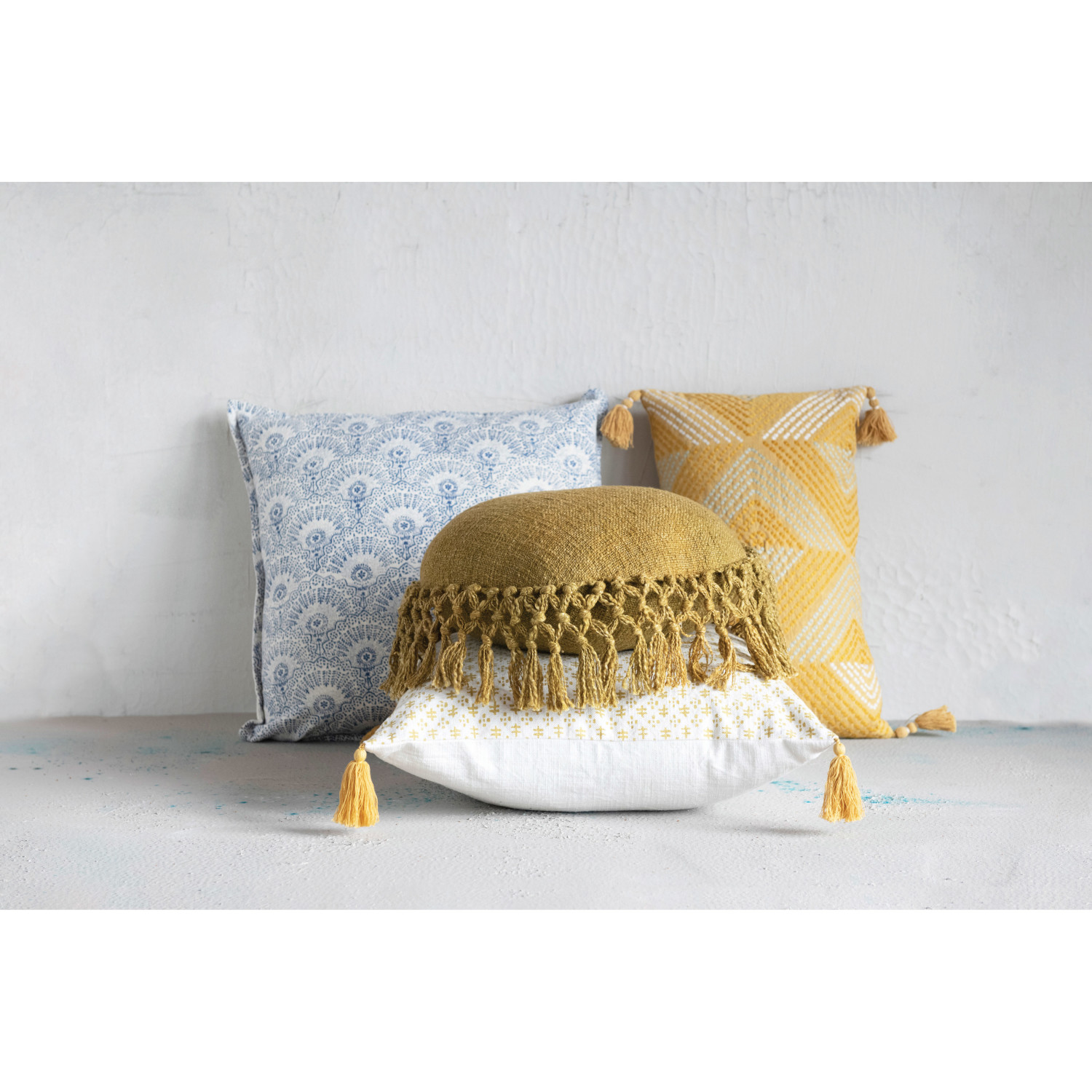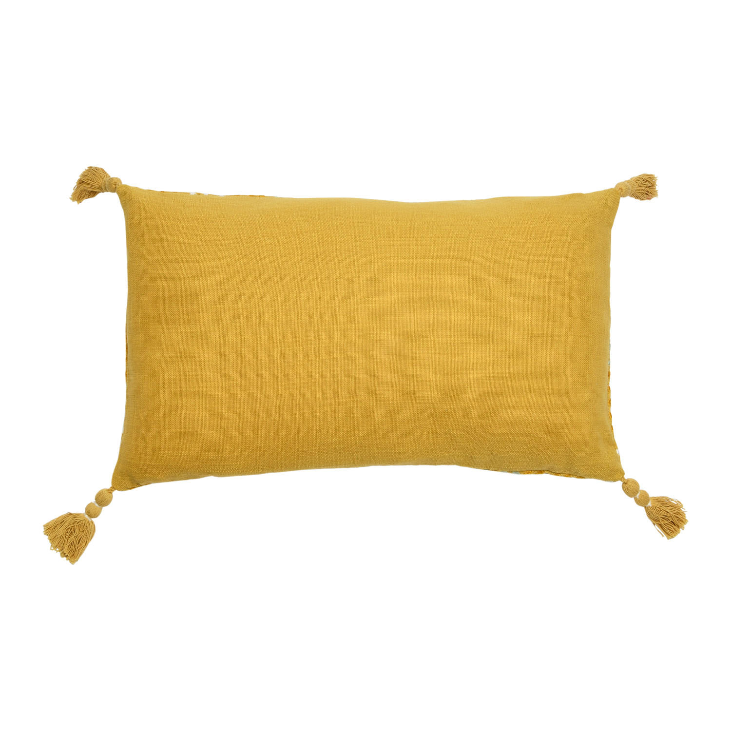 This cheerful lumbar pillow features durable woven cotton construction with geometric embroidery and decorative tassels. Mustard, white, and grey cotton lumbar pillow with geometric embroidery and tassels; Mustard cotton encasement on back. Express your constantly evolving style with the simple addition of this eye-catching pillow. Removable cotton throw pillow cover and insert; 30 degree wash, do not bleach, tumble dry low, do not dry clean, medium iron from reverse.