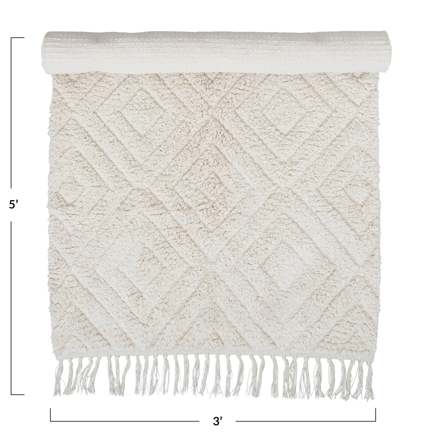 Catalog Name: 3' x 5' Cotton Tufted Rug w/ Diamond Pattern & Fringe, Cream Color