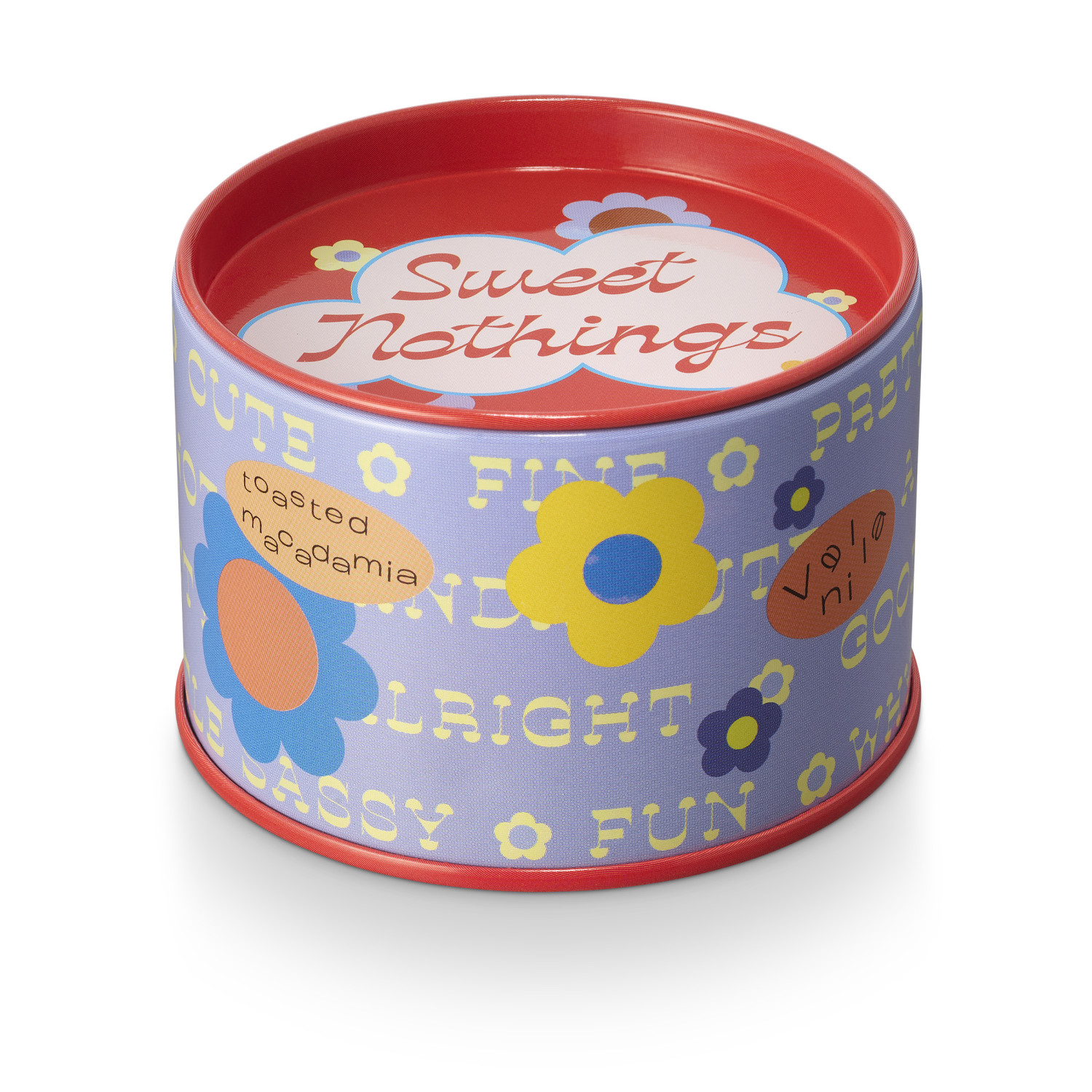A lidded tin wrapped and stickered to the max in affirmations and sugar coated positivity, with a pop of contrasting color on the top and bottom rolled edges.